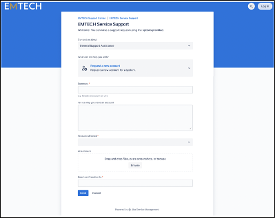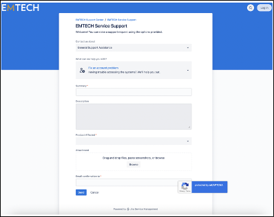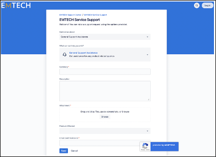 To address any general questions or inquiries regarding the product, resolve account issues, or request the setup of a new account on the EMTECH portal/products, please select the “General Support Assistance” option to submit a ticket to the EMTECH support team.